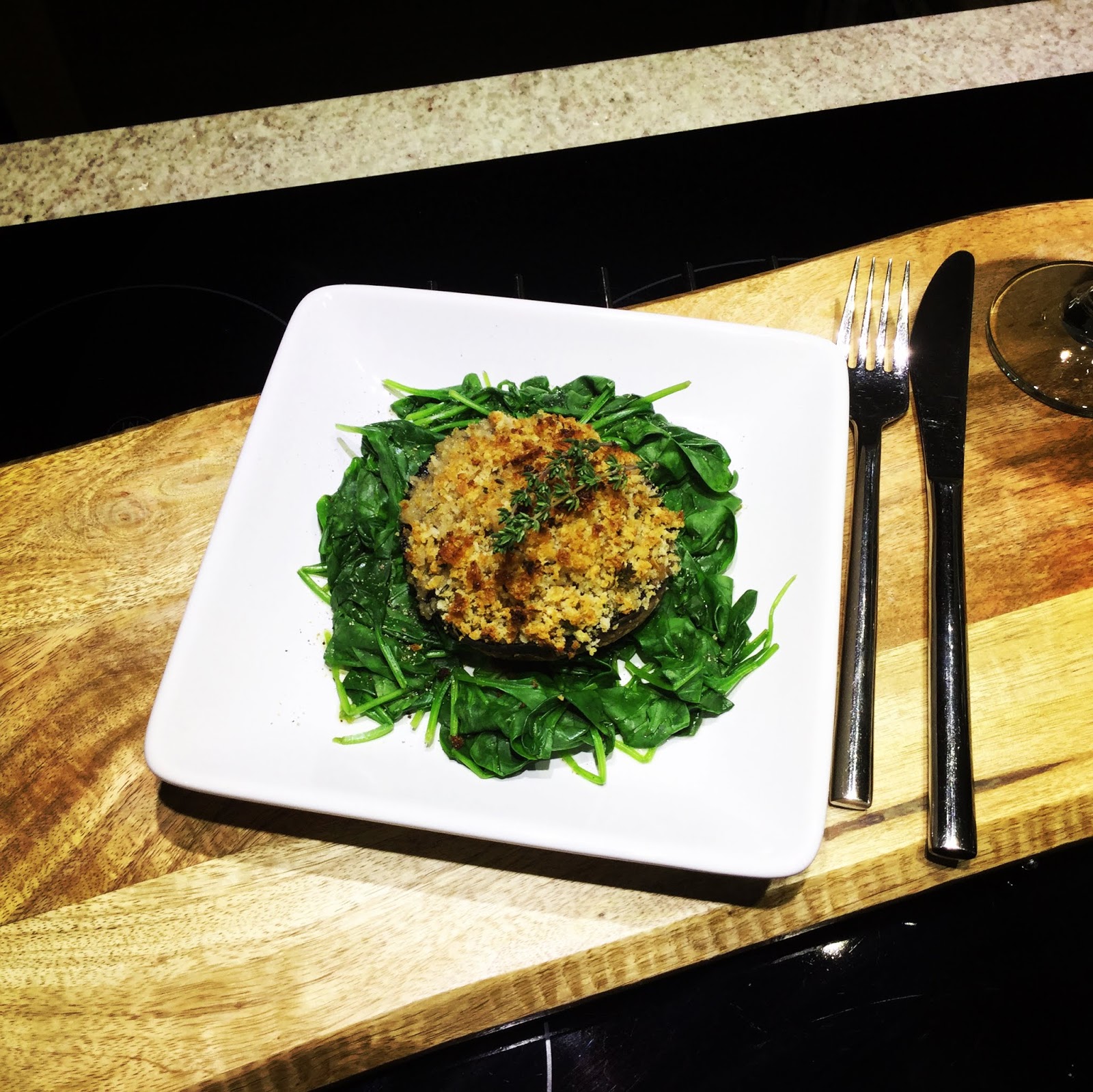 Remove the stalks from the mushrooms, then chop them and set aside. Line an ovenproof dish with foil and brush with olive oil, then sit the mushrooms on top. Arrange the sliced feta over each one. Mix the breadcrumbs with the rest of the ingredients and the chopped mushroom stalks, then season really well. Drizzle with olive oil then bake in a preheated oven at 190C for about 20-25 minutes until the mushrooms are tender and the topping is golden brown. Garnish with thyme sprigs and serve with wilted spinach.